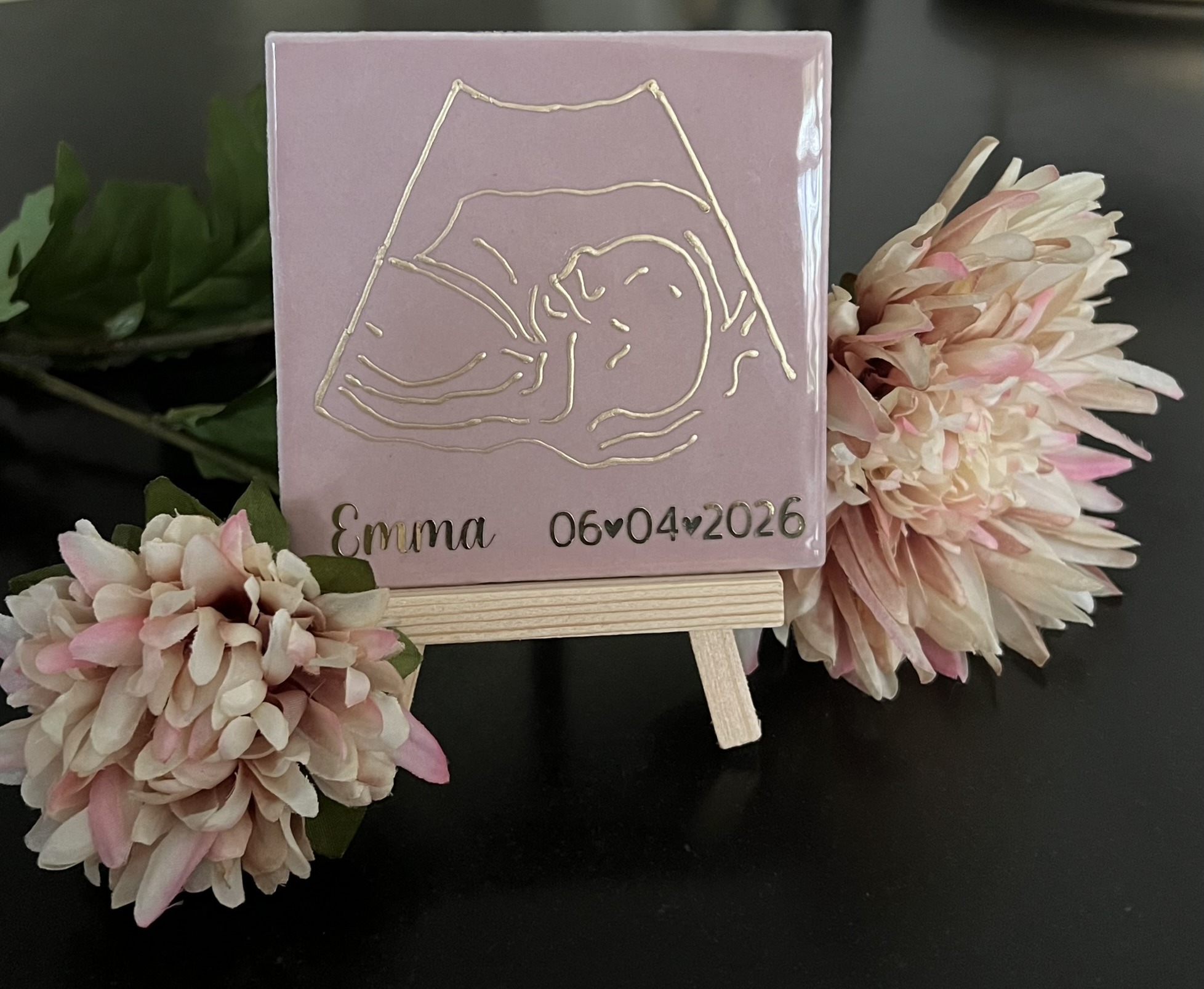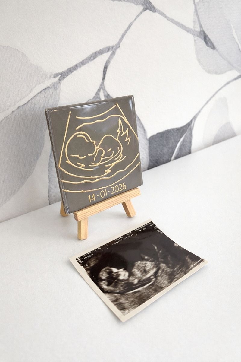 Deze handgemaakte echotegel met goudkleurige lijnen is gebaseerd op een echte echo en gepersonaliseerd met de uitgerekende datum of geboortedatum, eventueel aangevuld met een naam. Een liefdevol aandenken aan je eigen zwangerschap of een uniek cadeau na de zwangerschapsbekendmaking van je vriendin of zus. Staat prachtig in iedere babykamer en wordt geleverd inclusief houten standaard.